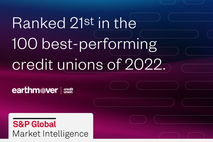 Read the full storyHow do we know you made the right choice? Earthmover Credit Union was recently ranked 21st in the 100 Best-Performing Credit Unions of 2022 in the United States by S&P Global Market Intelligence. S&P Global Market Intelligence launched this annual list in 2011 to assess the performance of community banks and credit unions. S&P Global Market Intelligence’s annual rankings were calculated using multiple performance metrics.