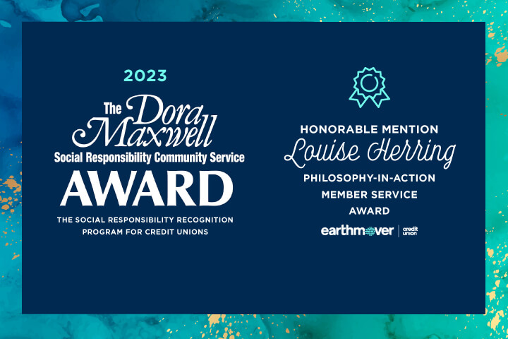 Earthmover Credit Union was honored to receive second place in the Dora Maxwell Social Responsibility Community Service award and was an honorable mention recipient of the Louise Herring Philosophy-in-Action Member Service Award.